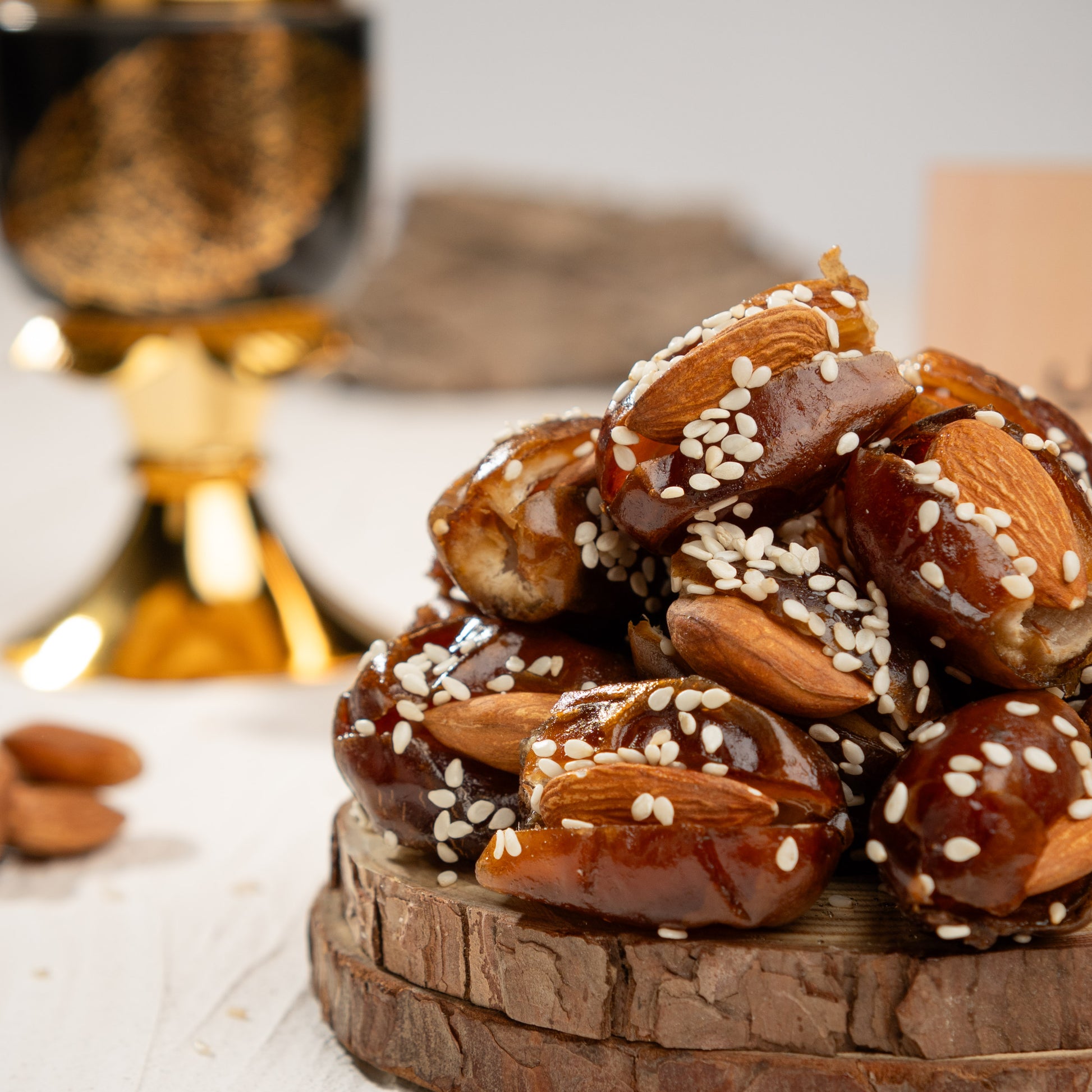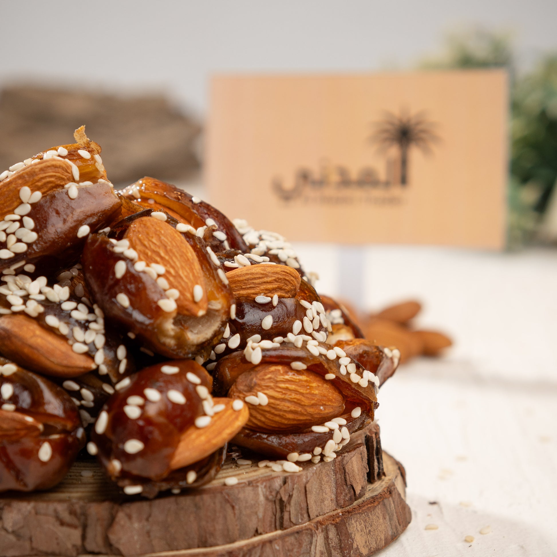 Indulge in the luxurious taste of Brown Assorted Dates (Almond), topped with a drizzle of honey and a sprinkle of sesame seeds. These premium dates, freshly crafted in Saudi Arabia, are filled with crunchy Almonds, offering a perfect blend of natural sweetness, nuttiness, and a delightful crunch.